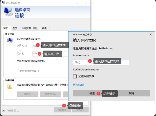 2.电脑B上找到mstsc(电脑左下角,点击搜索,输入“mstsc”即可调出此页面),输入电脑A上得到的远程地址和用户名,点击连接。连接后,输入电脑A的密码,点击确认,如图所示: