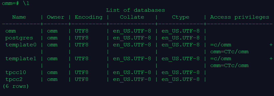 (三)、分别使用\l和\l+两个元命令查看数据库信息