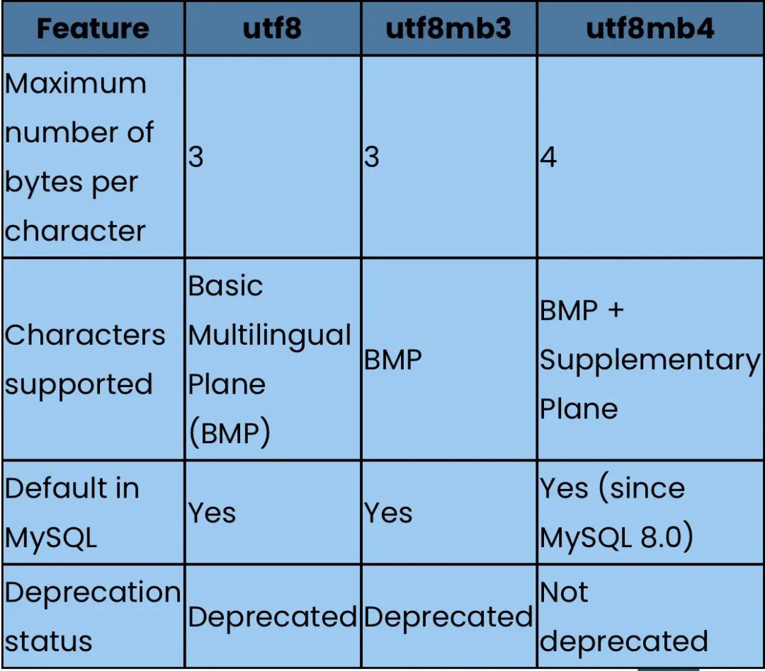 张鹏华:这个吃过大亏,现在很多订单里面会有表情符号,如果直接保存订单内容会直接从表情符号后截断,没有后面的内容风之帆:因为MySQL的utf8是阉割版的utf8,utf8mb4才是真正的utf8。邵NewBee:被坑过一次,项目开发上线了发现不支持表情回复。精灵福将马国成:我们公司最开始一个项目,当时MySQL数据库设置utf8,项目使用了半年,然后录入了广东那边一个人身份证名称带有生僻字,导致入库报错,后来我们把utf8改成utf8mb4就好了。MySQL的utf8只支持每个字符最多三个字节,而我们需要的是最多四个字节,从而我们在操作字符串时,会遇到一些很难溯源的bug(比如表情存储)。MySQL在2010发布了utf8mb4来支持四个字节,可以说MySQL的utf8mb4是我们真正意义上的UTF-8。MySQL本意是想在utf8上保持空间和速度,但是在使用utf8的char列时,实际使用的空间比预期更大,速度也慢,而且无法保存“”这样的字符,MySQL发布了utf8mb4来绕过了这个问题。在MySQL 8.0中,推荐使用的编码是utf8mb4。这种编码方式完全兼容utf8,每个字符最多占4个字节,就可以支持更多的字符,原来的utf8编码只能存储最多三个字节的字符,这在存储某些国家的文字或罕见字时有些困难了。从MySQL 8.0版本开始,其默认的连接字符集从latin1改为了utf8mb4,同时字符序也从latin1_swedish_ci改为了utf8mb4_0900_ai_ci。当使用utf8mb4字符集时,通常推荐使用utf8mb4_unicode_ci或utf8mb4_general_ci排序规则。官方在后续的 MySQL 版本也会逐渐删除 utf8。在深入探讨 utf8mb4 的好处之前,我们先澄清一下 utf8mb4 代表什么。在 MySQL 中,“utf8”是指支持 Unicode 字符集的字符编码,每个字符最多使用三个字节。然而,MySQL 中原始的 utf8 实现并没有涵盖所有 Unicode 字符。另一方面,utf8mb4 是 utf8 的修改版本,它支持完整的 Unicode 字符集,包括表情符号和其他补充字符,每个字符最多使用四个字节。MySQL 中原始的 utf8 实现仅支持基本多文种平面(BMP)中的字符,大约占所有 Unicode 字符的 90%。另一方面,utf8mb4 支持整个 Unicode 字符集,包括表情符号和其他补充字符。它通过每个字符最多使用四个字节而不是 utf8 使用的三个字节来实现此目的。下表显示了 utf8 和 utf8mb4 之间的区别:注意:历史上,MySQL 使用字符集 utf8 作为 utf8mb3 的别名。但是,从 MySQL 8.0.28 开始,utf8mb3 仅在 SHOW 语句的输出和信息架构表中引用该字符集时使用。未来,utf8 有望成为 utf8mb4 的参考。为了避免任何歧义,建议在引用该字符集时显式指定 utf8mb4。如您所见,utf8、utf8mb3 和 utf8mb4 之间的主要区别在于每个字符的最大字节数。utf8 和 utf8mb3 只能存储 BMP 中的字符,而 utf8mb4 还可以存储补充平面(Supplementary Plane)中的字符。这意味着 utf8mb4 可以支持更广泛的字符,包括表情符号、数学符号和其他特殊字符。这三个字符集之间的另一个区别是它们在 MySQL 中的默认状态。utf8 是 MySQL 5.7 及更早版本中的默认字符集,而 utf8mb3 是 MySQL 8.0 中的默认字符集。但是,utf8mb4 是 MySQL 8.0.28 及更高版本中的默认字符集。最后,MySQL 8.0 中已弃用 utf8 和 utf8mb3。这意味着它们最终将从 MySQL 中删除,因此建议使用 utf8mb4 代替。因此,如果您需要存储所有 Unicode 字符,包括表情符号和其他补充字符,那么您应该使用 utf8mb4。但是,如果您只需要存储 BMP 中的字符,那么 utf8 可能就足够了。如果您认为这篇文章有些帮助,还请不吝点下文章末尾的"点赞"和"在看",或者直接转发朋友圈,