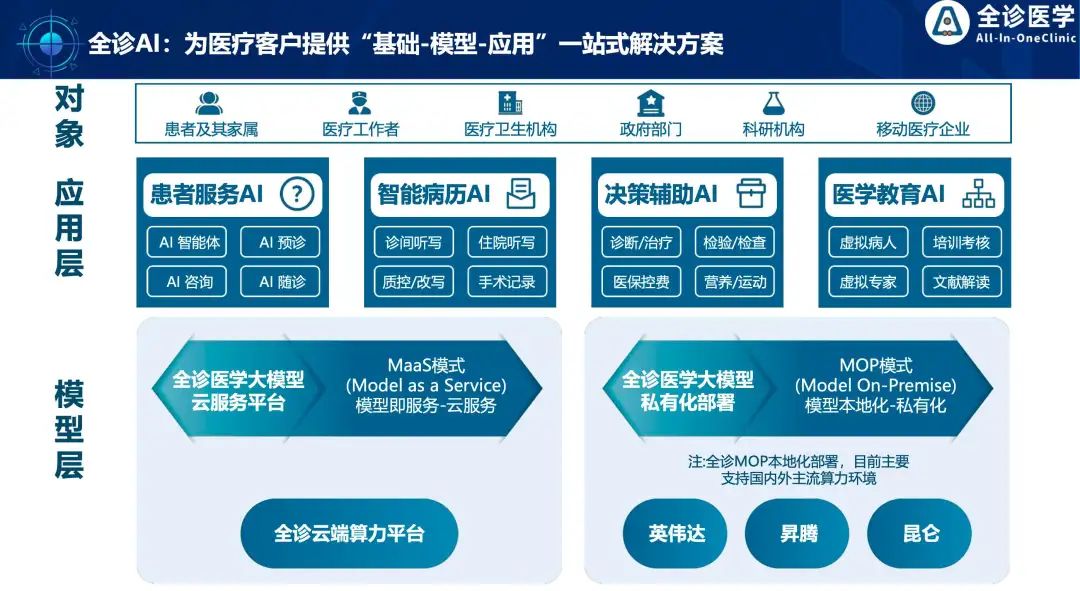 全诊通是一家专注于医疗SaaS和人工智能的公司,成立于2016年,其推出的基于大模型的全诊AI医疗服务智能体,覆盖患者服务、智能病例、决策辅助、医学教育等,为医疗客户提供”基础-模型、应用的一站式解决方案,旨在提升医疗服务的效率和质量。截止目前,全诊通的产品和方案已在16省成功应用,包括50+家大中型医院、100多个区县卫健局、15000+ 医疗机构。