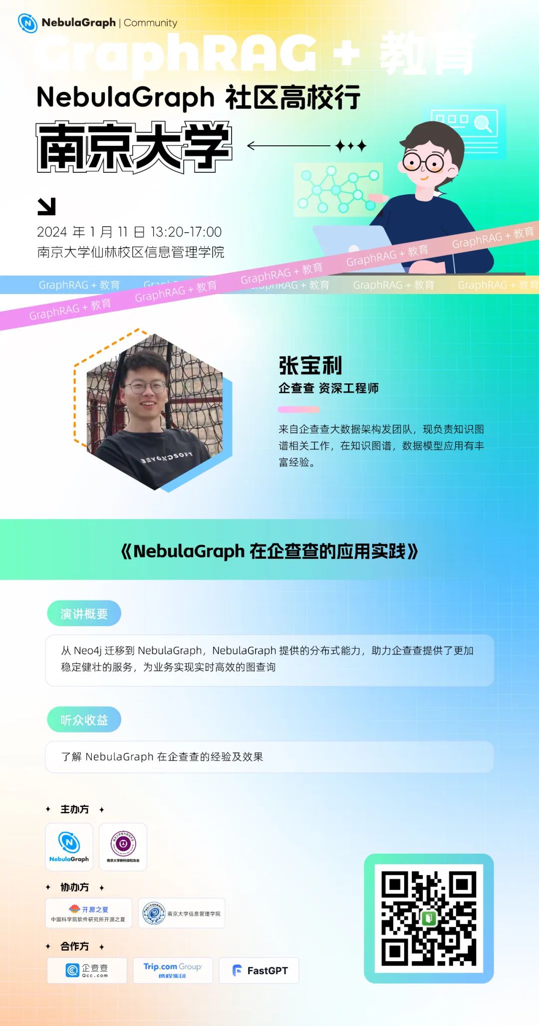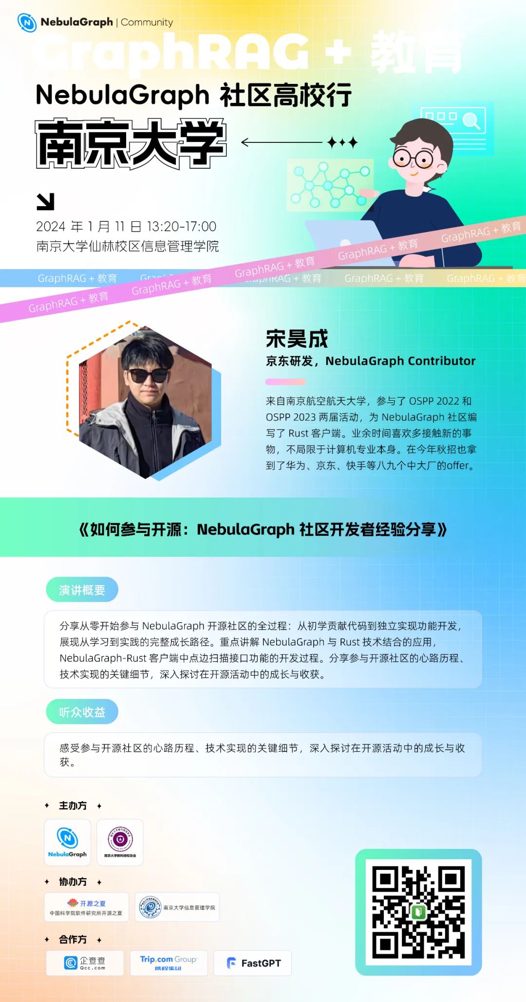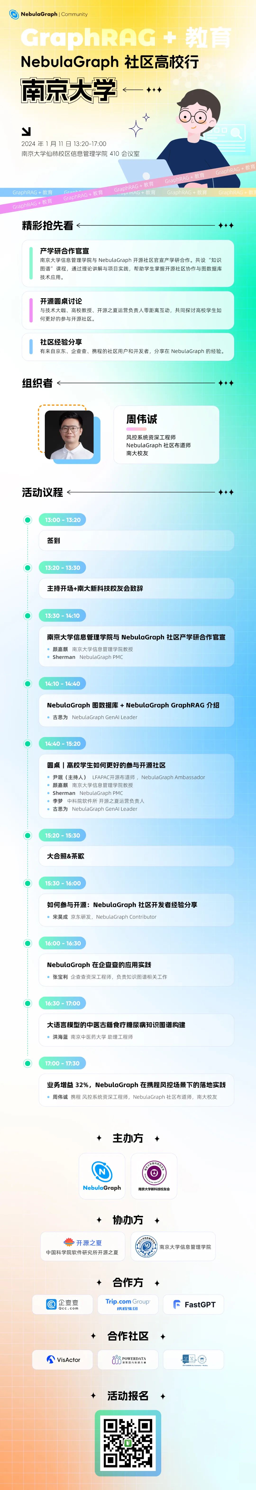 本次活动由 NebulaGraph 开源社区和南京大学新科技校友会主办,南京大学信息管理学院和中国科学院软件所开源之夏协办。特别感谢 NebulaGraph 社区布道师周伟诚老师的精心组织和筹备,欢迎社区小伙伴们来线下参加!