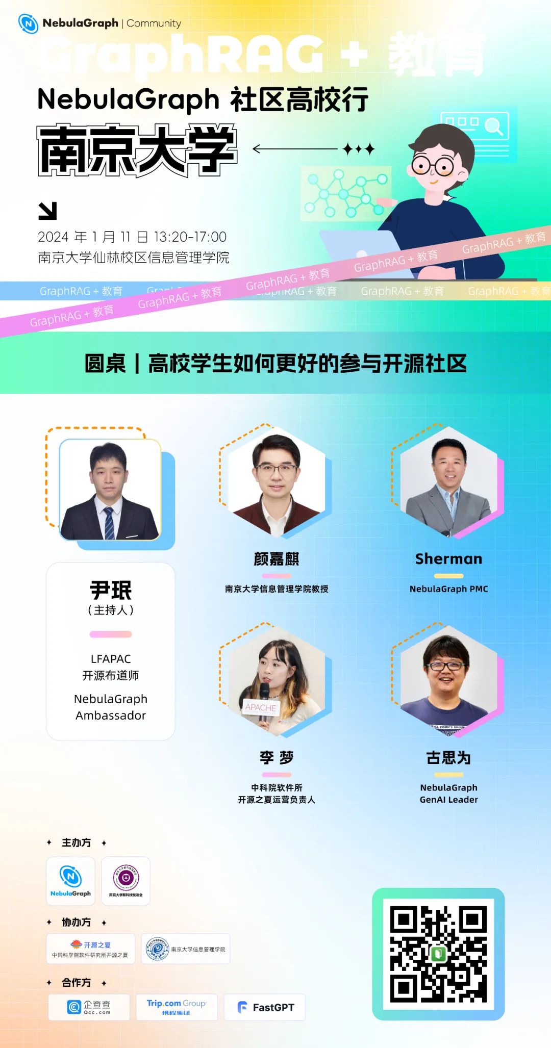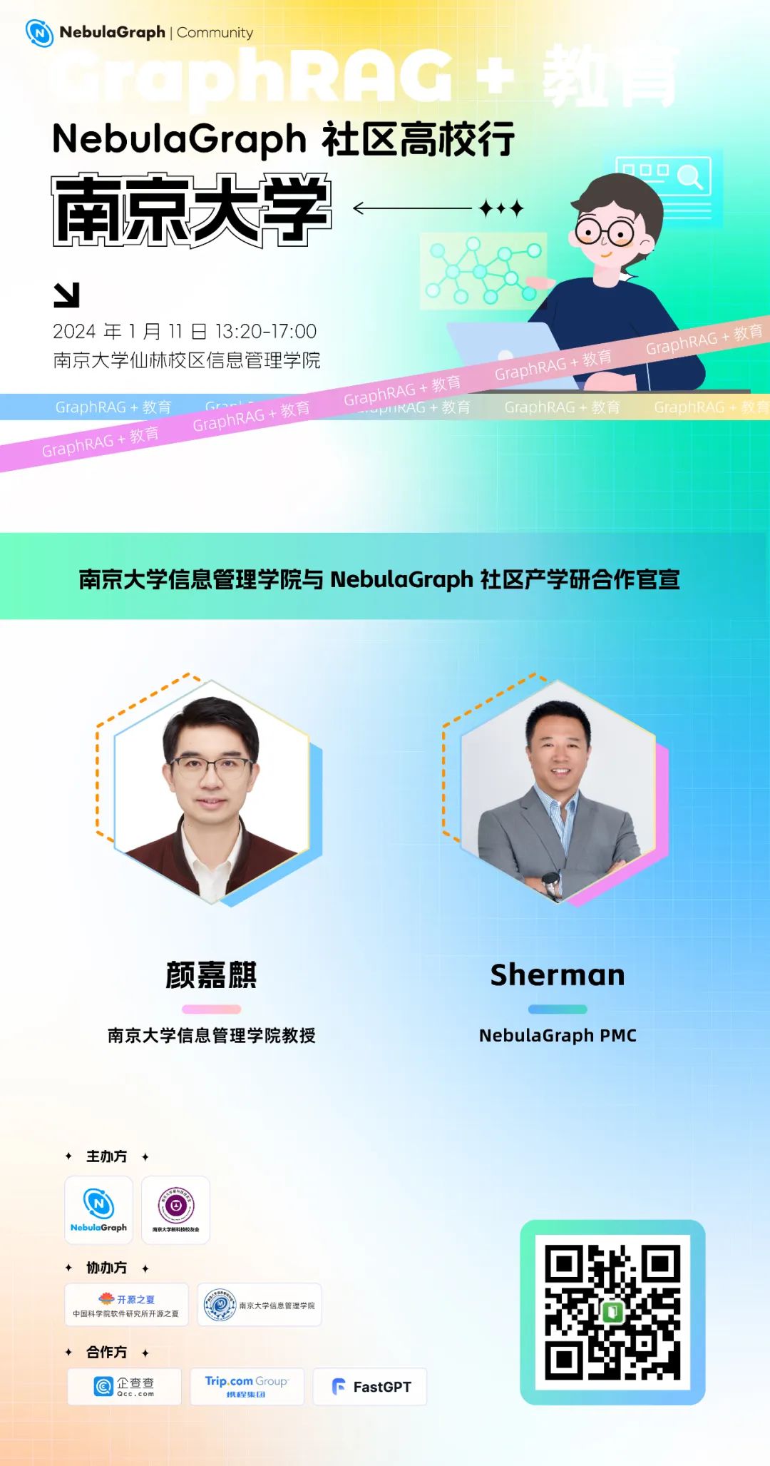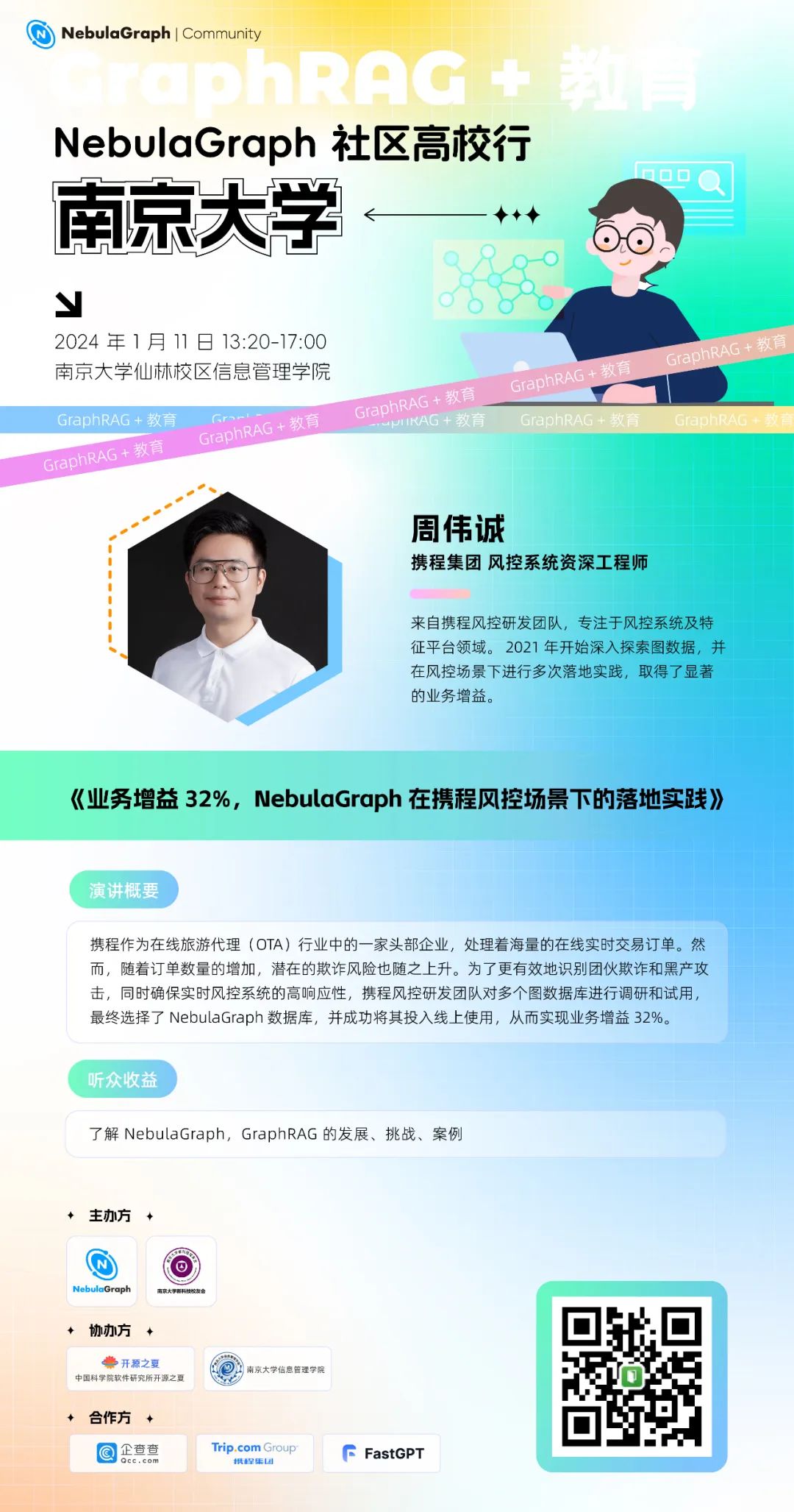 本次活动由 NebulaGraph 开源社区和南京大学新科技校友会主办,南京大学信息管理学院和中国科学院软件所开源之夏协办。特别感谢 NebulaGraph 社区布道师周伟诚老师的精心组织和筹备,欢迎社区小伙伴们来线下参加!