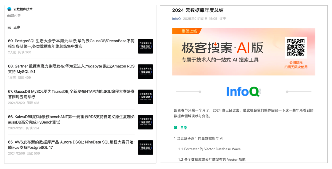 连续发表 70 篇云数据库行业动态和云数据库 2024 年度总结;
