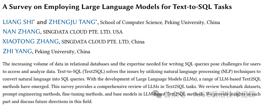 这篇论文是关于自然语言到 SQL(NL2SQL)技术的综述,全面探讨了 NL2SQL 在大语言模型(LLM)时代的发展现状、面临的挑战、解决方案、评估方法、错误分析以及未来的研究方向。从架构链接(Schema Linking)、检索(Database Content Retrieval)、信息获取(Additional Information Acquisition)、编码策略(Encoding Strategy)、解码策略(Decoding Strategy)、提示策略(Task-specific Prompt Strategy)、NL2SQL的后处理策略、NL2SQL基准测试、NL2SQL评估与错误分析等几个方面全面对文本转 SQL 进行了详细描述。
