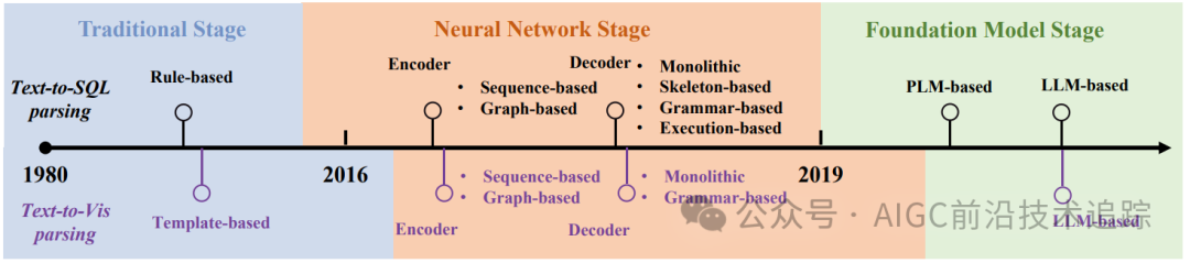 我们从语言模型的角度描述了 NL2SQL 解决方案的演变,将其分为四个阶段。 对于 NL2SQL 的每个阶段,我们分析了目标用户的变化以及解决挑战的程度。
