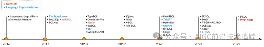 在方法上,数据增强方面,早期用 PPDB 生成释义、收集模板填充,新方法如 Li 等微调 T5 模型预测自然语句,Zhong 等通过生成-转换-过滤流程确保数据质量,Guo 等引入潜在变量鼓励问题多样性,Radhakrishnan 等模拟用户查询行为,Wang 等利用 PCFG 采样组合 SQL 查询。编码部分,有编码词元类型、基于图的方法(如 GNN 编码 DB 模式结构及后续改进)、自注意力机制(如关系感知自注意力)、适配预训练语言模型(如用 BERT 编码及多种调整嵌入方式)和预训练(如 TaBERT 用表格数据预训练)。解码方面,包含树状、草图、自下而上解码,注意力机制及其变体,复制机制(如指针网络及改进),中间表示(如 SemQL 及后续改进)及其他技术(如设置约束、执行引导解码等)。学习技术涵盖完全监督(如主动学习、交互或模仿学习、元学习、多任务学习)和弱监督(如强化学习、利用记忆缓冲区、学习辅助奖励、建模潜在变量)。其他技术涉及数据库链接、模型设计(如模板模型、混合模型、将子模块任务转化为阅读理解任务、优化 Transformer)、SQL 生成(如探索不同动作序列、搜索 DB 值插入查询)和上下文相关处理技术。