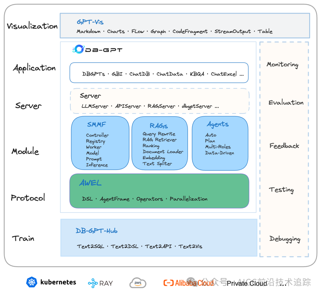 目的是构建大模型领域的基础设施,通过开发多模型管理(SMMF)、Text2SQL 效果优化、RAG框架以及优化、Multi-Agents框架协作、AWEL(智能体工作流编排)等多种技术能力,让围绕数据库构建大模型应用更简单,更方便。