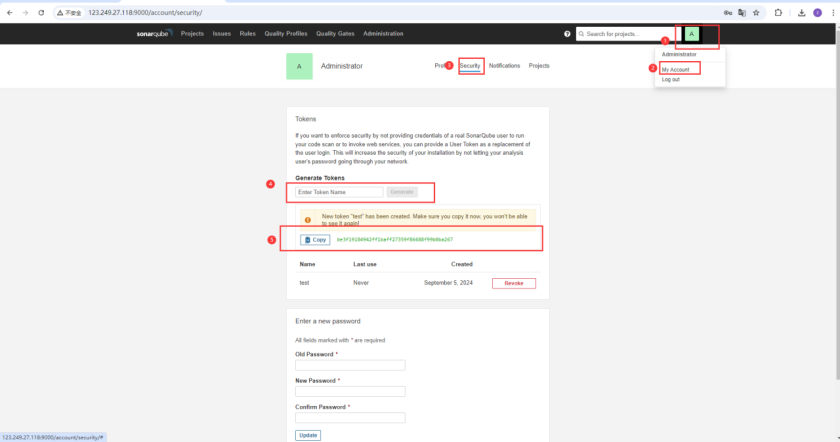 获取 Sonar Qube 的令牌(填写一个名称,生成 token)