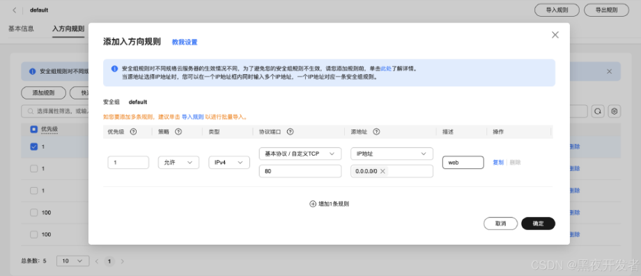 为了让公网能够访问到我们的系统,我们放开一下 80 端口,这个去华为云后台操作如下。