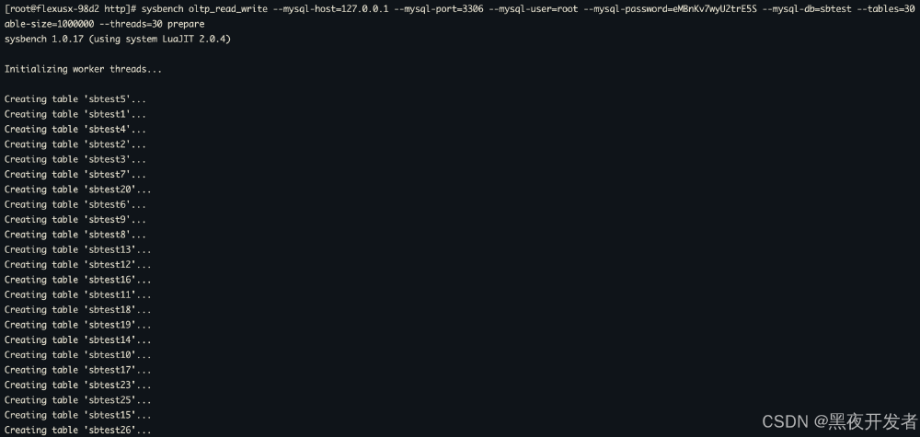 sysbench oltp_read_write --mysql-host=127.0.0.1 --mysql-port=3306 --mysql-user=用户名 --mysql-password=密码 --mysql-db=sbtest --tables=30 --table-size=1000000 --threads=30 prepare