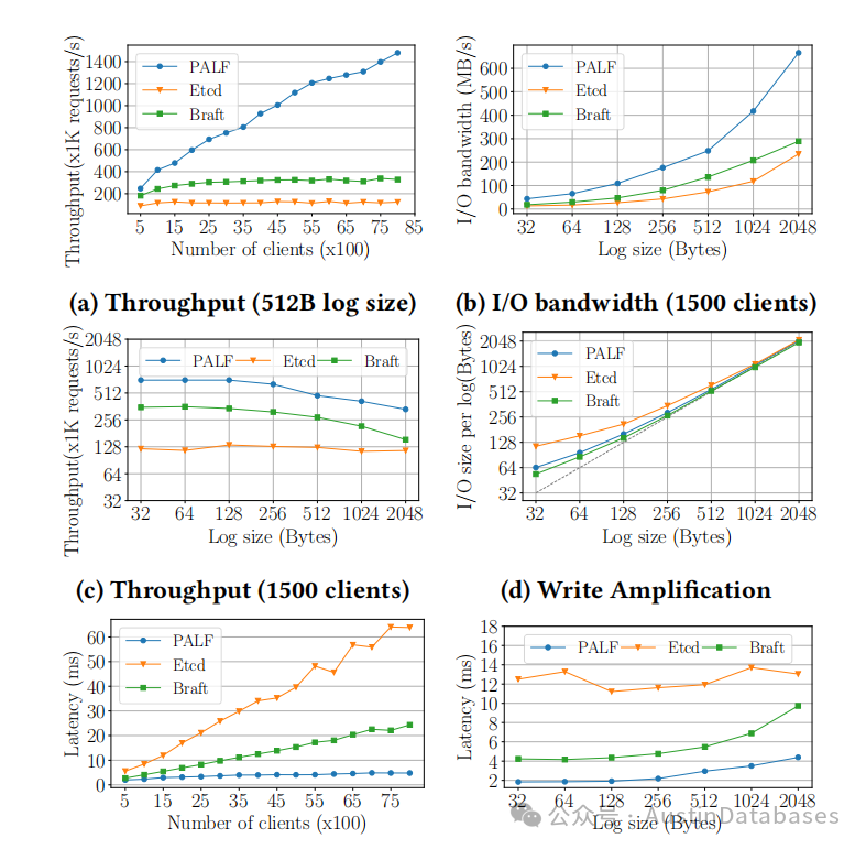 客户端模型。我们为 PALF、etcd-raft 和 braft 构建了闭环客户端。每个客户端在其先前追加的日志提交之前不会向领导者追加新的日志。为了模拟预写日志系统的常见用例(作为分布式数据库的内部组件),客户端与领导者位于同一位置并直接向领导者追加日志。