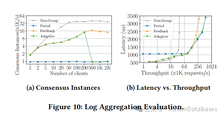 共识协议给数据库带来了额外的开销,其中至少包含两个网络消息(日志复制和确认)和一些 CPU 周期。在一个实例中批量处理多个日志条目是减少共识带来的开销的常用方法。批量处理日志的核心是如何确定合适的批处理大小。定期批量处理日志或在 I/O 工作器空闲时立即批量处理日志(反馈)是两种常用的方法。但是,前者可能会在低并发下导致额外的延迟。后者可能会损害吞吐量,因为大量的小请求可能会在高并发下使 I/O 设备不堪重负。