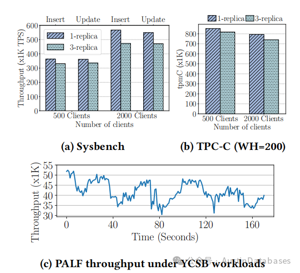 在基准测试实验(三副本)和生产工作负载期间,OceanBase 中 PALF 的性能分析如表 1、图 12c 和图 12d 所示。结果远低于 §8.1 中描述的 PALF 峰值性能,后者在使用 512 字节有效负载的情况下每秒可以达到 140 万次追加操作。因此,PALF 的性能对于 OceanBase 服务密集型写入来说绰绰有余。