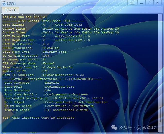 *然后在SW1用dis stp 接口 查看STP相关状态