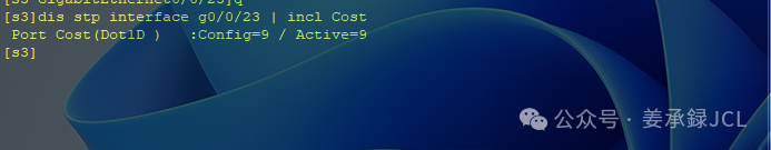 继续在SW3用dis stp interface g0/0/23 | incl Cost查看23接口STP cost值是否为9