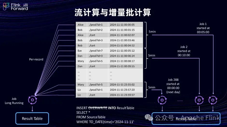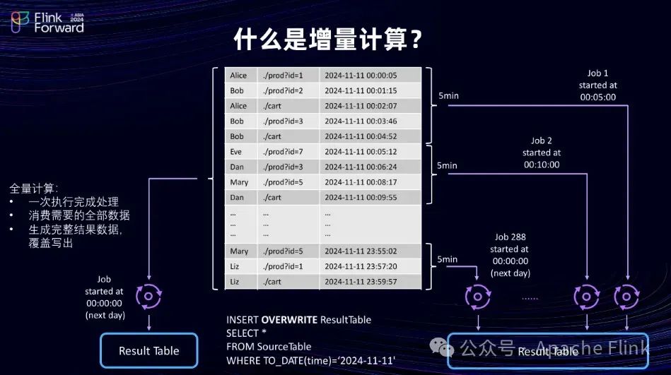 例如,这是一份记录双十一当天用户的访问记录,如果想要将其数据全量同步到结果表中,全量计算需要在次日凌晨启动作业,读取整个表的数据并写入结果表。而增量计算会将任务拆解为更小的处理单元,例如每五分钟处理前五分钟新增的数据,每次执行的结果与已有结果数据合并,最终会生成和全量计算一致的结果。因此,全量计算与增量计算的主要区别在于,对于一个计算目标,处理方式是一次性的还是多次的,处理的是全量数据还是增量数据。