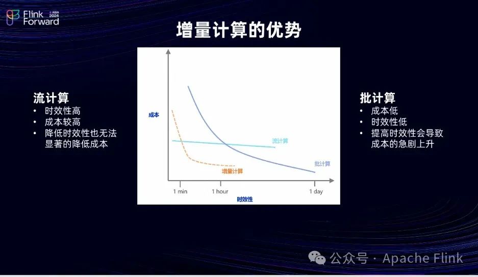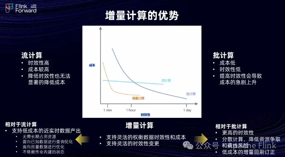 上图展示了流计算、批计算和增量计算在时效性与成本之间的关系。
