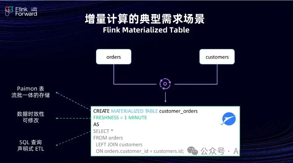 接下来谈谈为什么选择使用 Flink 来实现增量计算。首先,我们有了一个典型的需求场景:Flink Materialized Table。它希望能够提供一种类似数据库 Materialized View 的,简单且一体化的数据运维方式。用户只需编写一个 SQL 查询,无需担心底层是使用流计算还是其他方式,也无需自己构建复杂的 Workflow,Flink 就能够自动生成一个结果表,并自动刷新以满足声明的数据新鲜度。