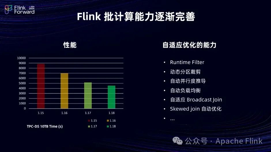 第二点是目前 Flink 的批计算能力已经逐步完善。在性能方面,从 1.15 到 1.18,Flink 的批处理性能差不多提升了一倍。此外,Flink 目前具备了很多自适应优化的能力,能够给增量批计算提供关键的支持。