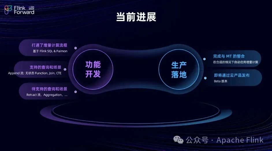 在生产中,我们已经完成了增量计算与 Materialized Table 的整合,使得 Materialized Table 能够在适当情况下自动启用增量计算,预计很快将在阿里云的实时计算 Flink 云产品上进行 Beta 版本发布。