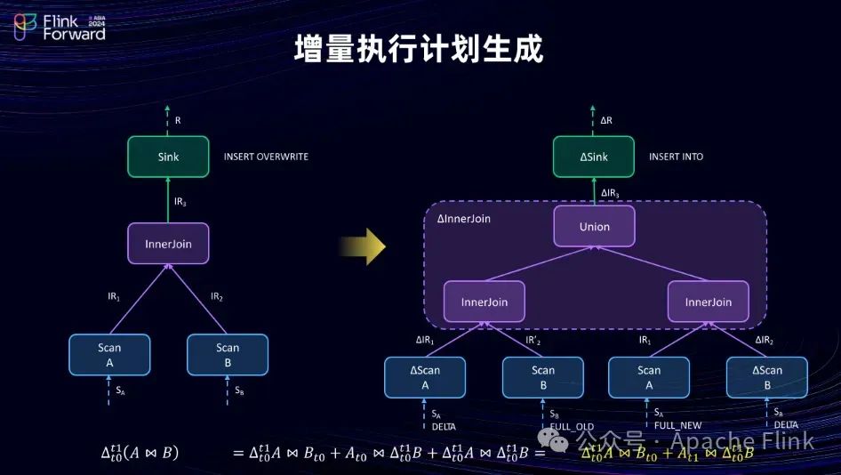 当然,前面的例子相对简单,看起来可能只是做了一个简单的算子替换,但实际上并非如此。事实上,我们需要的并不是仅仅做算子替换,而是基于原有的关系图来仿照和组合出一个整体的增量计划。现在来看一个复杂一点的例子,这是一个关于 Inner Join 的场景,即 A 和 B 进行 Join 操作,然后将全量结果写入结果表中。为了进行增量计算,首要目标是生成一个 delta R。而这个 delta R 会依赖于增量的 Sink 来产生输出。