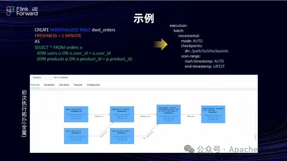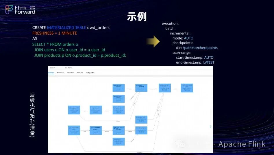 我们来看一个简单的增量计算示例。这个示例是基于 Materialized Table 构建的,它将一张订单表与用户信息和产品信息进行关联打宽。由于数据的新鲜度要求为一分钟,Materialized Table 判断其可以进行增量计算。因此,它会为 Flink 添加一些配置来启用增量计算。
