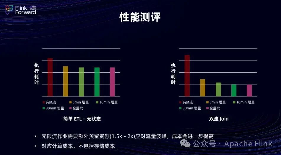 需要注意的是,我们使用的是有限流作业进行测试。然而在实际生产中,实时计算往往都是无限流作业。为了应对流量峰值并避免延迟,需要给这些作业预留额外的资源,这样一来,流作业的成本会进一步增加。
