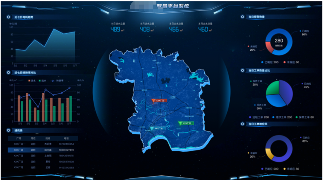 智慧运维系统作为泵站管理的核心,凭借高度集成的前沿技术,对泵站的日常运行实施全方位、多层次的精准监测与科学管理,其驾驶舱功能能够依据个性化需求,在大屏幕上综合展示泵站的各项关键业务数据,帮助管理者轻松掌握全局情况。