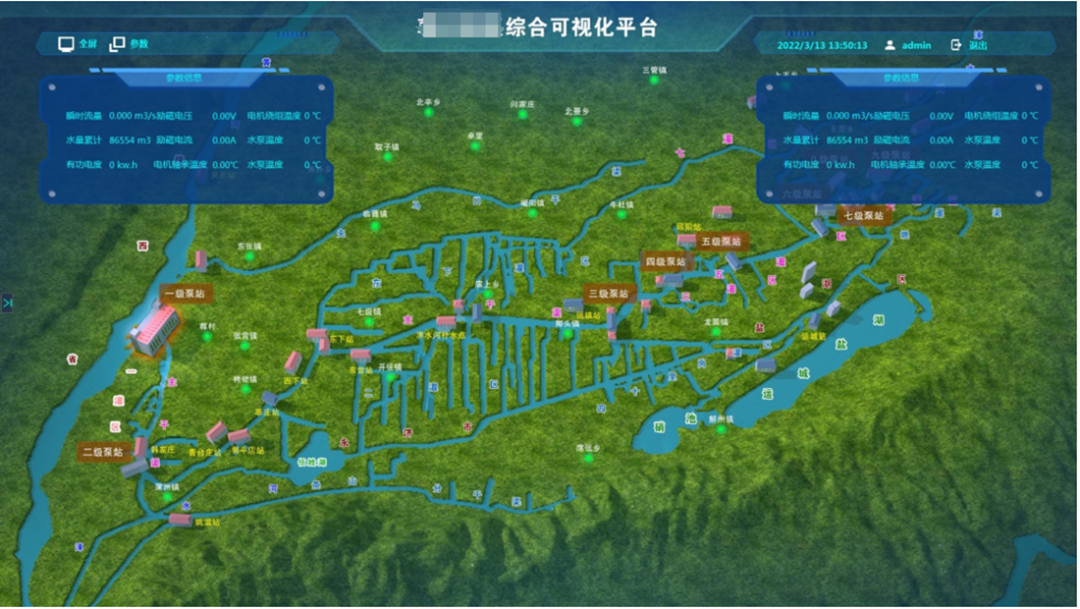 通过对泵站供水的地理位置信息进行3D绘制,精准展现地理布局,标注河道位置、走向及泵站位置。该系统实时接入泵站的电压、电流、流量等运行数据,通过图表直观展示泵站状态。