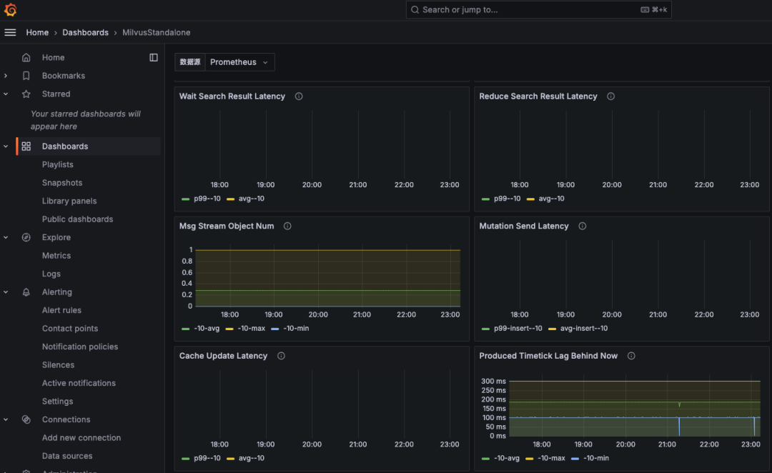 同时,一个 Milvus Standalone 监控看板(参见 https://github.com/milvus-io/milvus-docs/blob/v2.5.x/assets/standalone-monitoring/grafana/dashboards/milvus-standalone-dashboard.json)