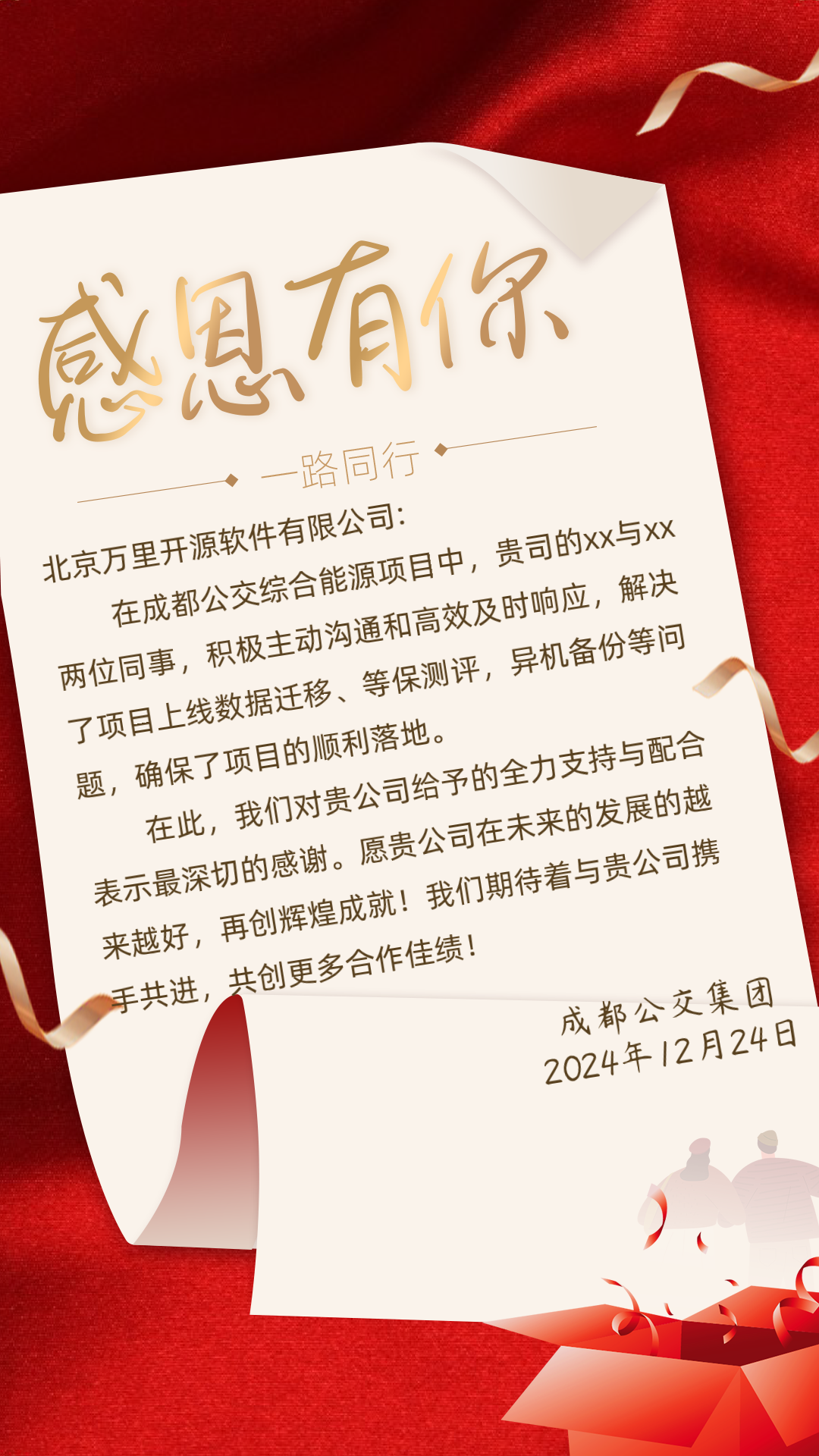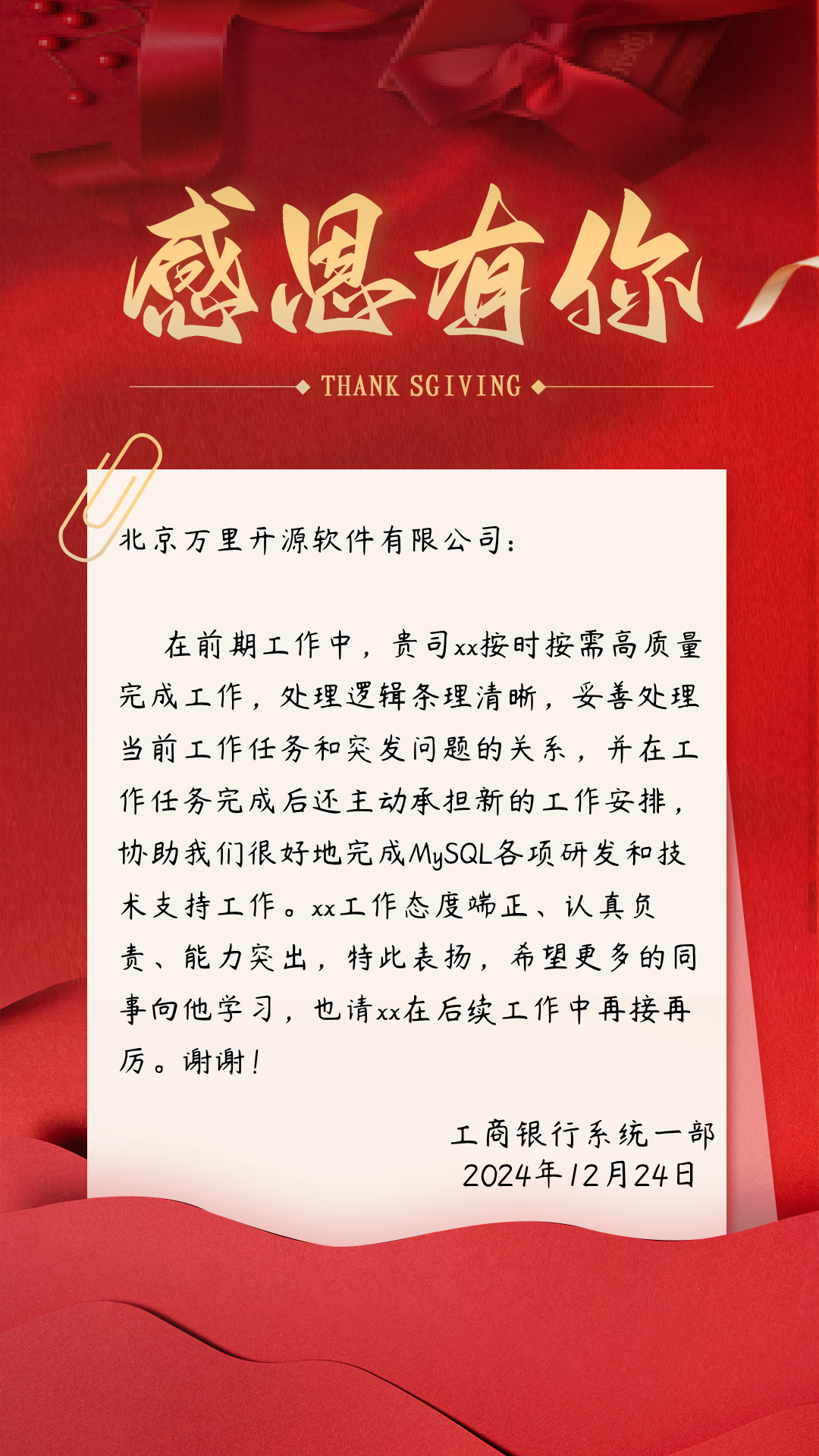 在2024年的尾声里,万里数据库先后收到金融、运营商、政务、交通物流、建筑、IT互联网、云厂商等政府单位和各行业客户的感谢信。其中,中国工商银行、河北移动、北京丰台区政务服务中心、中交二航局等客户对万里数据库积极履约、高质量交付、疑难问题解决、提供7*24小时技术服务、保障项目如期上线、稳定运行等方面给予了充分肯定。一封封表扬信和感谢信,是对万里数据库技术能力和服务水平的充分认可,也是鼓舞公司不断创新、突破前行的强大动力。