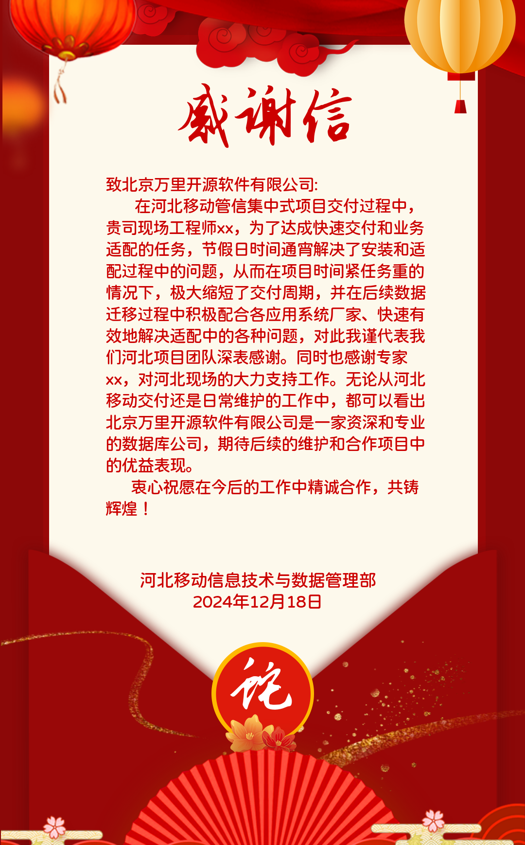 中国移动感谢信