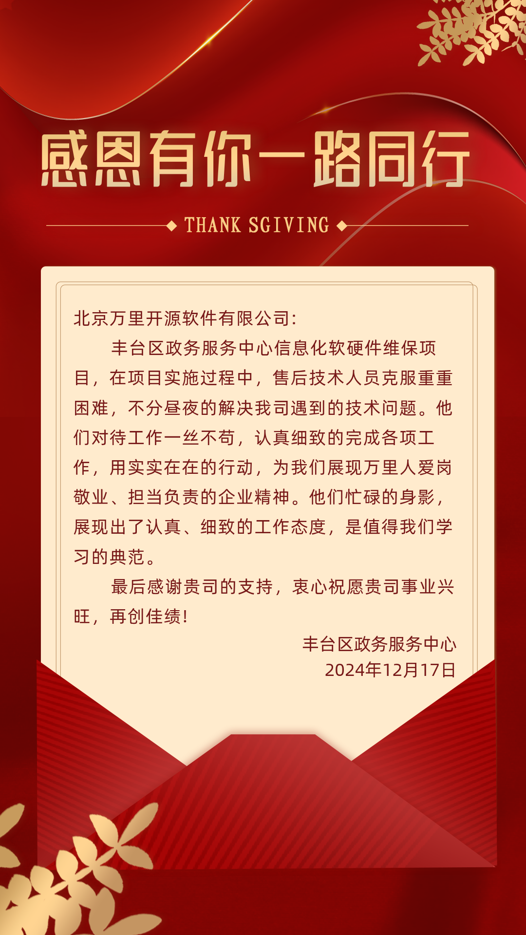 回顾2024,“万里人”以实际行动诠释了敬业精神和职业素养,凭借专业的知识、过硬的技术和周到的服务,确保客户的信息系统运行稳定,业务连续性得到保障,赢得了客户的认可。
