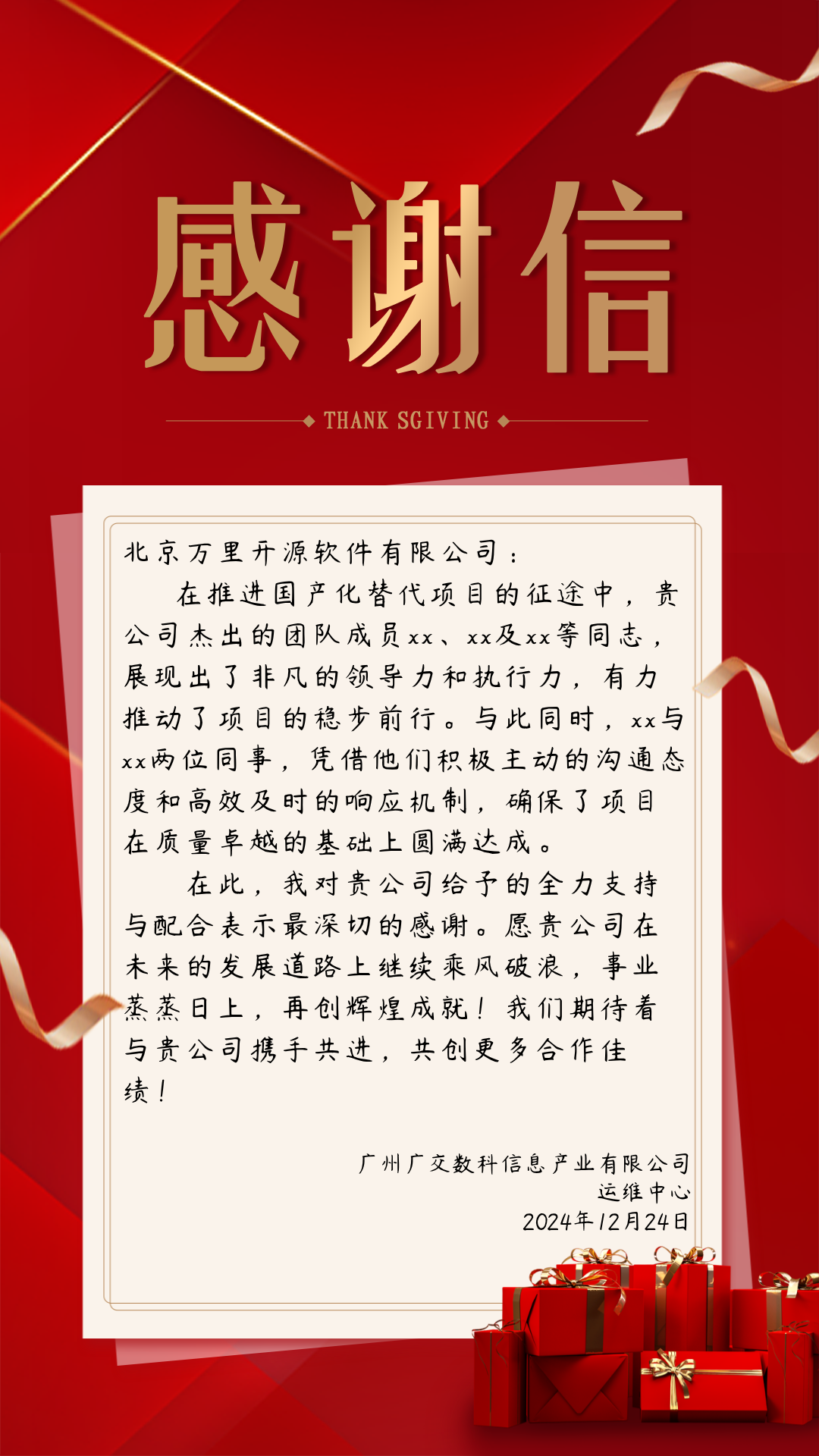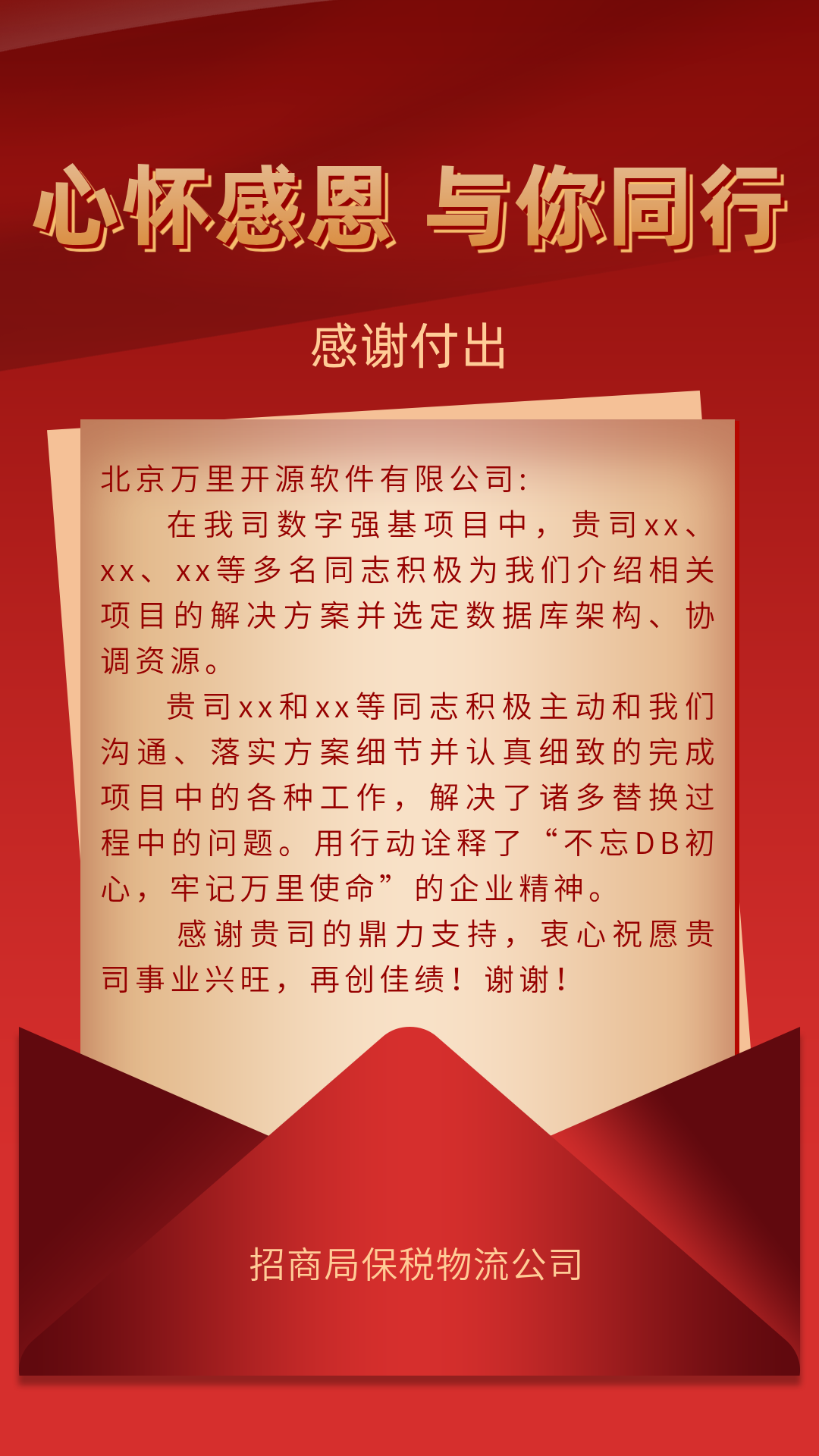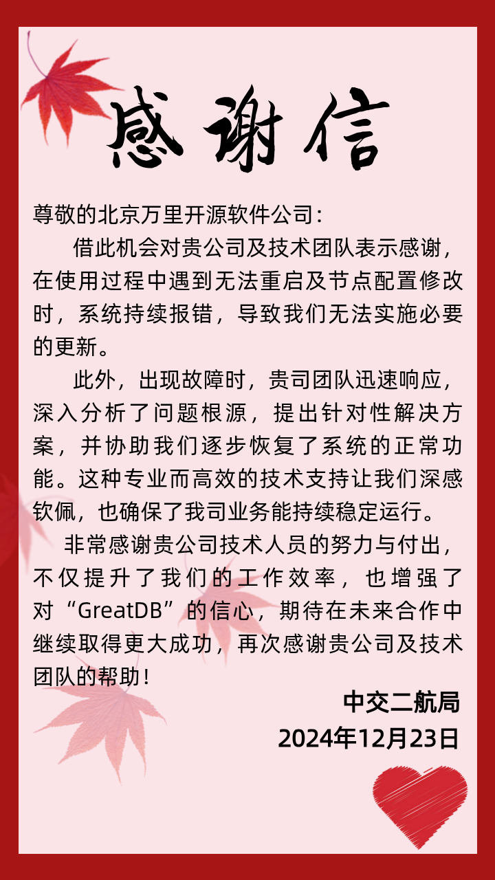 万分感谢客户们对万里数据库GreatDB产品及技术团队的认可,我们倍感荣幸。感谢信的背后是公司团队日夜往复的默默付出,更是一份份沉甸甸的责任。展望未来,万里数据库将持续加强自主创新,用更加稳定的数据库产品和愈发全面的技术支持服务客户,推动新一代信息技术应用创新与千行百业数字化转型的高质量发展。