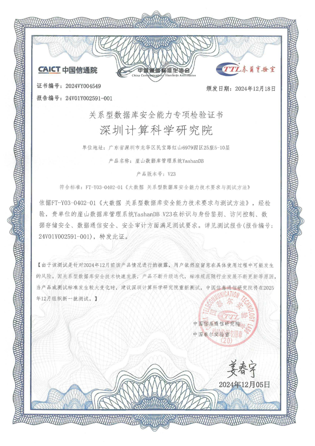 近日,在中国信息通信研究院(简称“中国信通院”)“可信数据库”关系型数据库安全能力专项测试中,YashanDB V23顺利通过测试,在关系型数据库安全能力方面均符合标准要求,可满足金融、党政、能源等关键行业对数据安全的需求。