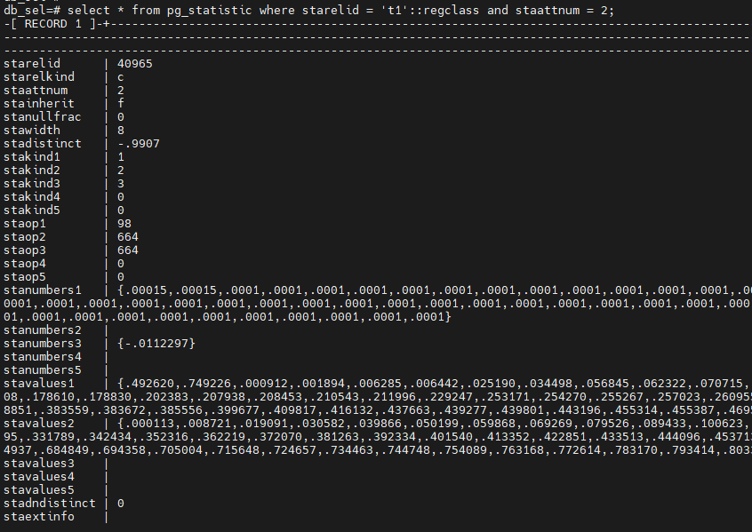 select * from pg_statistic where starelid = 't1'::regclass and staattnum = 2;