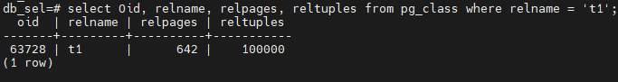 select Oid, relname, relpages, reltuples from pg_class where relname = 't1';