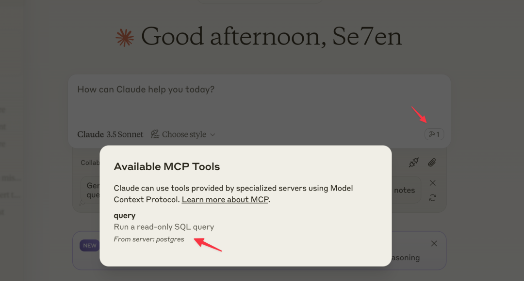 配置完毕后,重启 Claude Desktop。一切正常的话,你应该能在输入框的右下角看到一个锤子图标。点击锤子图标,可以看到 PostgreSQL MCP Server 提供的工具信息。