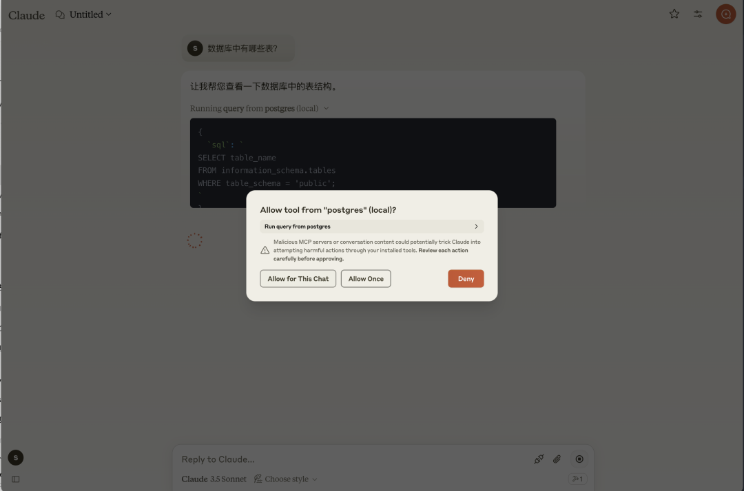 首先来问一个简短的问题:数据库中有哪些表? Claude 会判断出需要调用 MCP server 来查询 PostgreSQL 中的数据。这里会弹出一个窗口,需要用户授权。