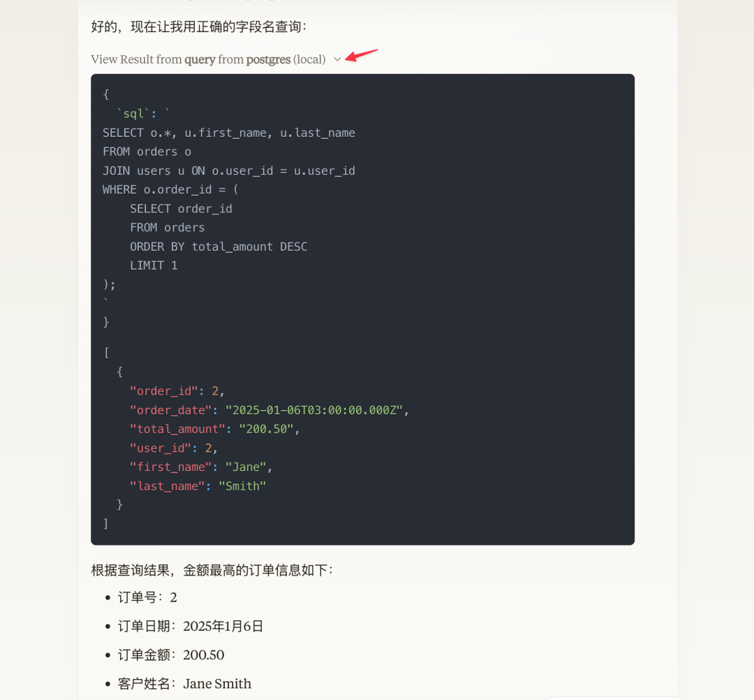 可以看到 Claude Desktop 向 MCP server 发送的请求以及得到的响应,说明这个结果确实是从 PostgreSQL 数据库中查询得到的。