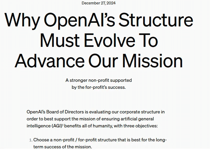 12月27日,成立时就定位为“非营利公司”的 OpenAI 宣布重组,对公司架构进行分拆重组。分拆后,OpenAI 一部分将采用“公共利益公司结构(PBC)”架构,全力追求营收、拓展盈利版图,旨在为自身发展注入充沛资金;而另一部分,将坚守非营利组织阵地,致力于运用 AI 助力医疗、教育、科学等领域的慈善事业,为人类福祉添砖加瓦。