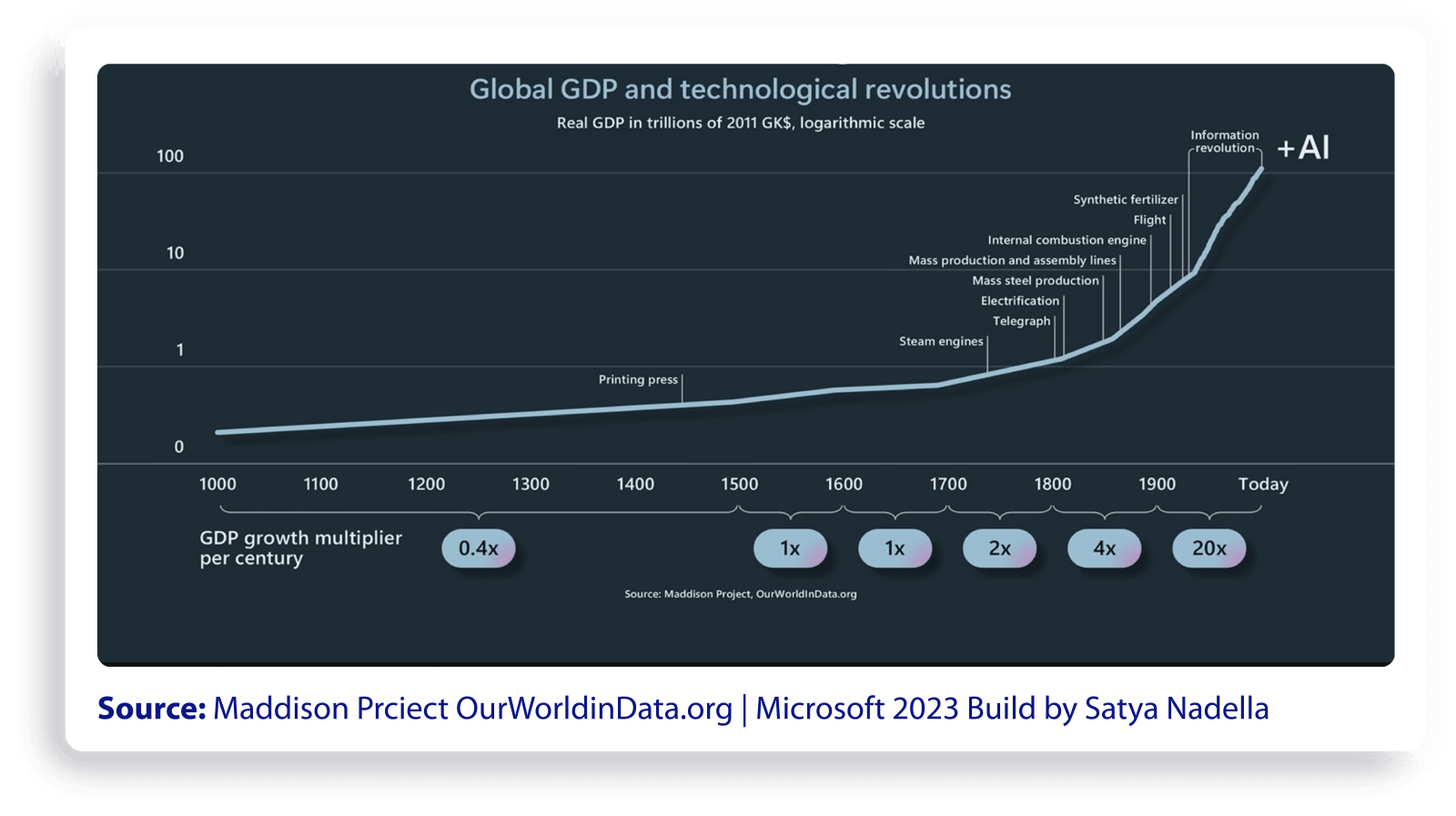每一次技术革命都会带来社会财富的再分配和劳动力再就业。如果下图所示,这波AI作为一种新质生产力,所带来社会财富的激增远超前两次技术革命—工业革命和电气革命。