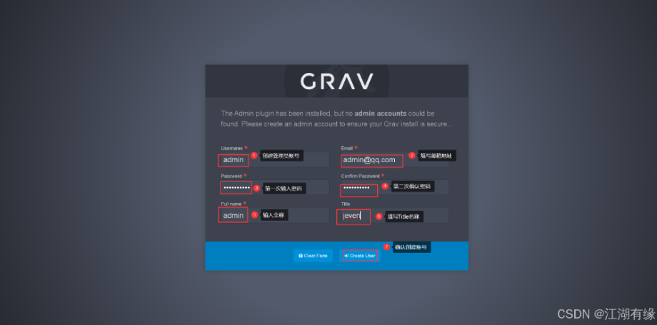 根据 Grav 初始页提示,自定义创建管理员账号信息。