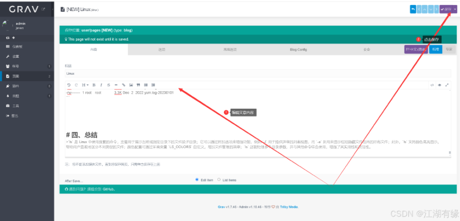 在文章编辑器中,使用 Markdown 语法编辑文章内容,完成后点击保存即可。