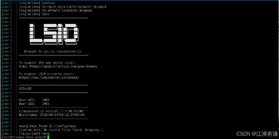 [root@flexusx-51a1 grav]# docker compose up -dWARN[0000] /data/grav/docker-compose.yaml: `version` is obsolete[+] Running 2/2 ✔Network grav_default Created 0.0s ✔Container grav-grav-1 Started 0.2s