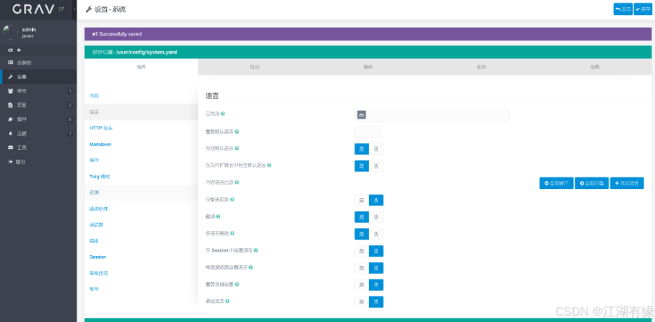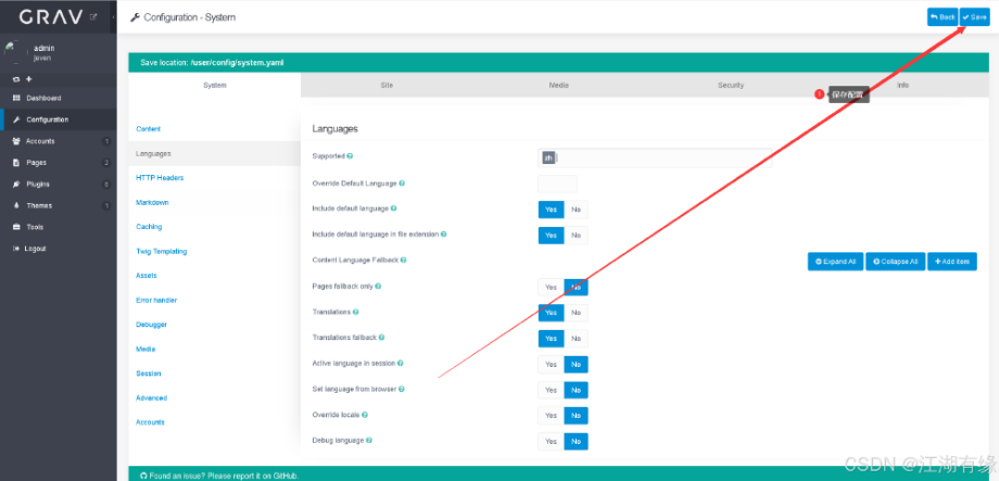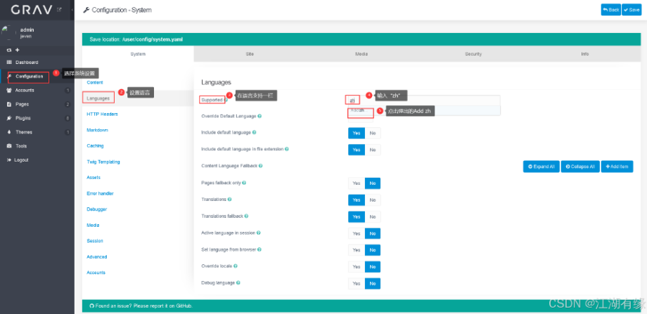 在 Grav 后台管理页面,点击“Configuration”(配置)-->“Languages”(语言),在“Supported”(已支持)后面的文本框中输入“zh”,然后点击弹出的“Add”(添加)按钮来添加中文支持。