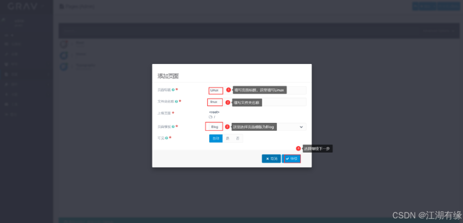 在页面管理模块,点击“+增加”选项。在弹出的页面信息编辑窗口,自定义填写相关信息,其中页面模块这里选择 Blog。