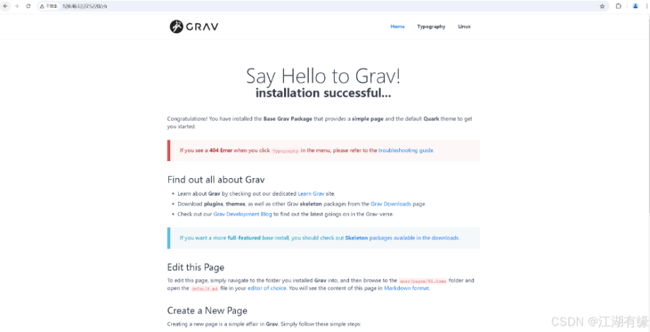 浏览器访问地址:http://弹性公网 IP 地址:5220,将 IP 替换为自己服务器 IP 地址,进入 Grav 初始页。
