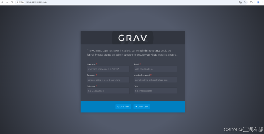此时,我们加上端口号,重新输入访问地址:http://IP地址:5220/admin/,将IP替换为自己云服务器的弹性公网IP地址,则可正常访问到Grav后台管理页面。