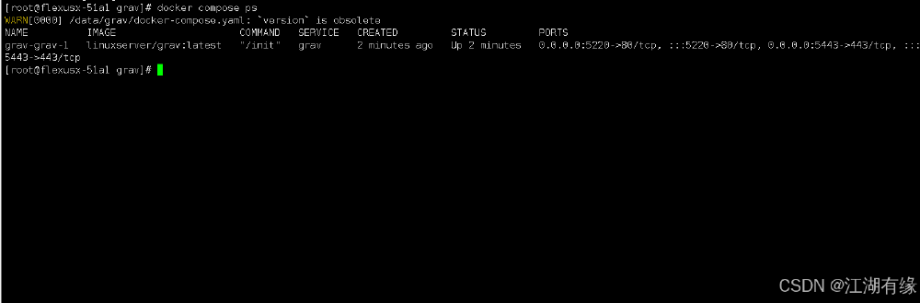 [root@flexusx-51a1 grav]# docker compose psWARN[0000] /data/grav/docker-compose.yaml: `version` is obsoleteNAME IMAGE COMMAND SERVICE CREATED STATUS PORTSgrav-grav-1 linuxserver/grav:latest "/init" grav 2 minutes ago Up 2 minutes 0.0.0.0:5220->80/tcp, :::5220->80/tcp, 0.0.0.0:5443->443/tcp, :::5443->443/tcp